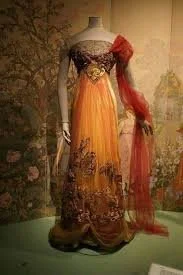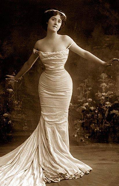 Extravagant, floor-length dresses with bodycon silhouettes , sleeveless or off the shoulder, bright colors, rich fabrics (silks), lace, pearls, and elaborate updos with headpieces were standard, signaling wealth and status.